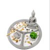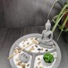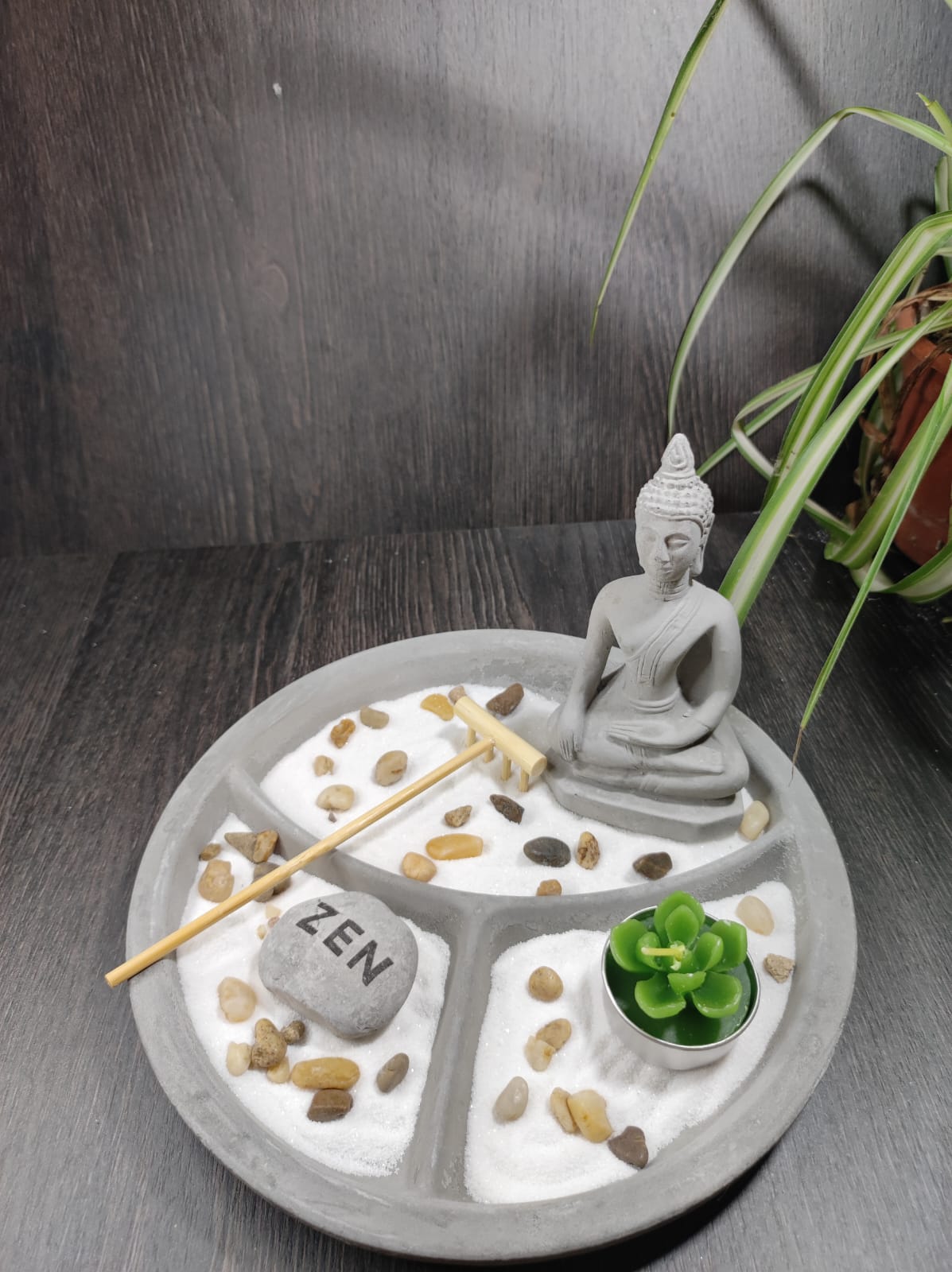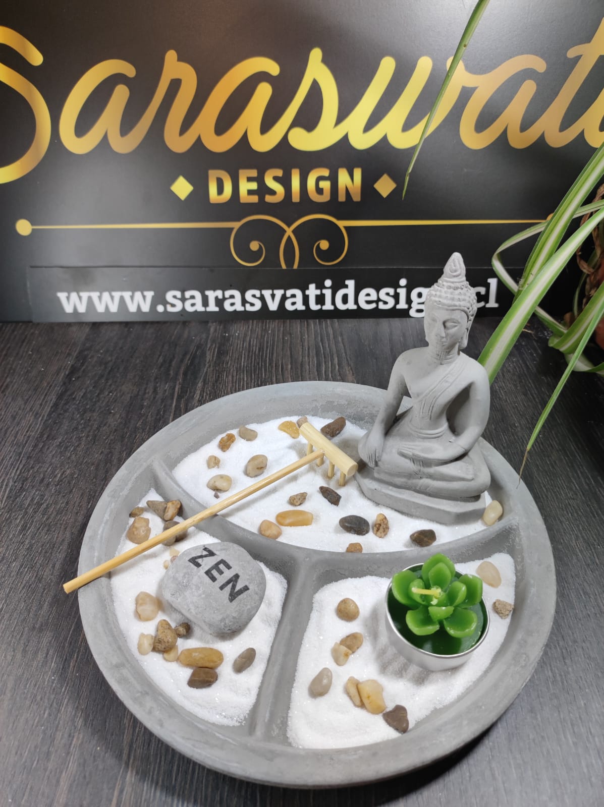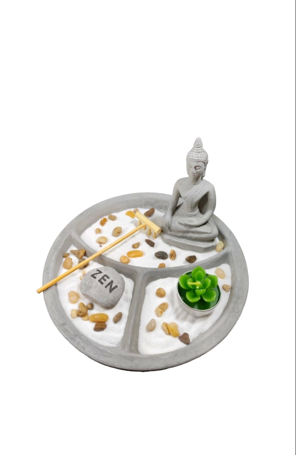 Incluye: Arena de Cuarzo, piedras, rastrillo, porta vela, figura de meditación, vela, porta incienso.