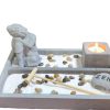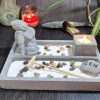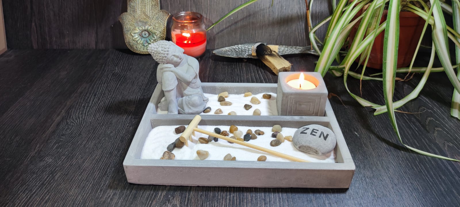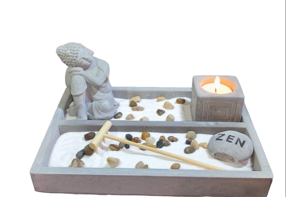 Incluye: Arena de Cuarzo, piedras, rastrillo, porta vela, figura de meditación, vela
